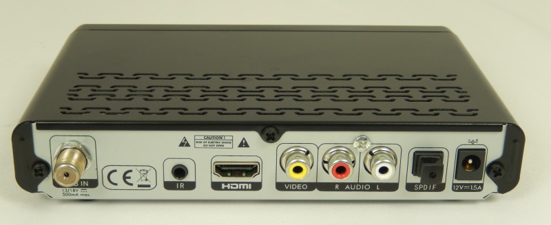 Zadný panel obsahuje vstup satelitného tuneru, vstup pre IR čidlo (nie je súčasťou balenia), HDMI výstup, analógové výstupy CINCH pre aduio a video a digitálny optický SPDIF audio výstup. Prijímač má externý zdroj 12V.