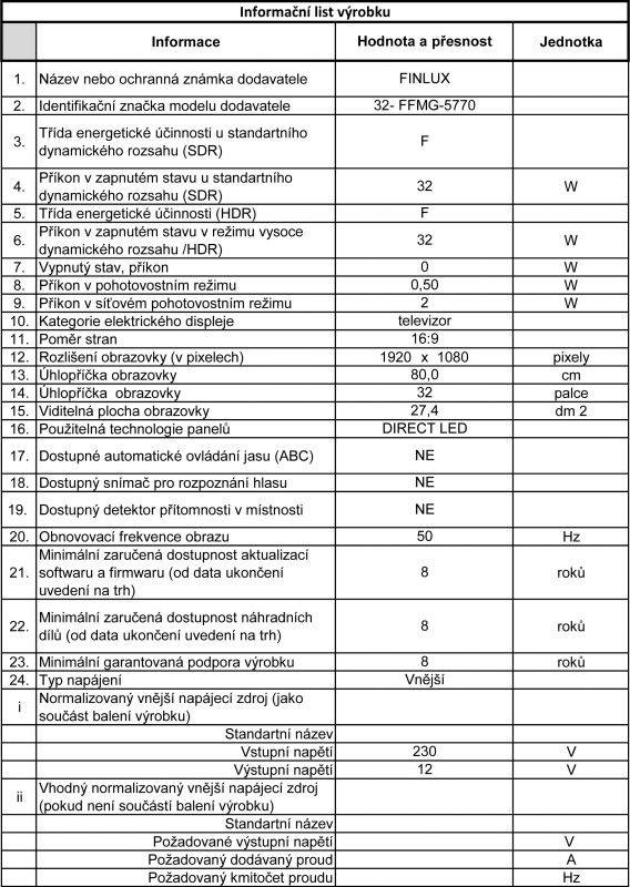 Napájanie / Spotreba / Energ. trieda 12VDC z adaptéra 230V AC 50Hz, Príkon v StandBy : < 0.5W, Prevádzkový príkon : 32 W , Energetická trieda F