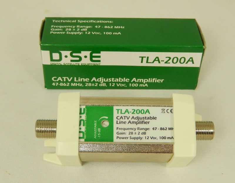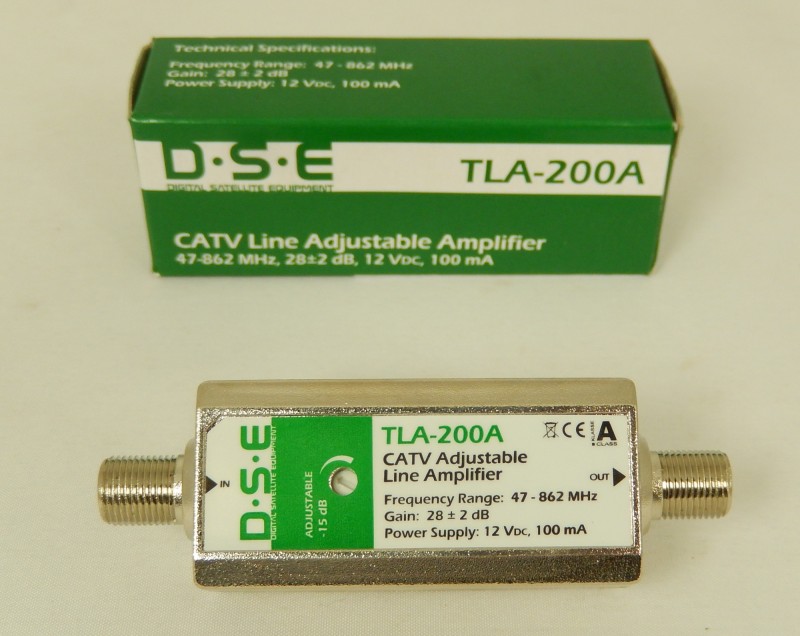 Lineárny zosilňovač pre analógový a digitalny signál DVB-T DSE TLA-200A . Pracuje v rozsahu 47 - 862MHz.