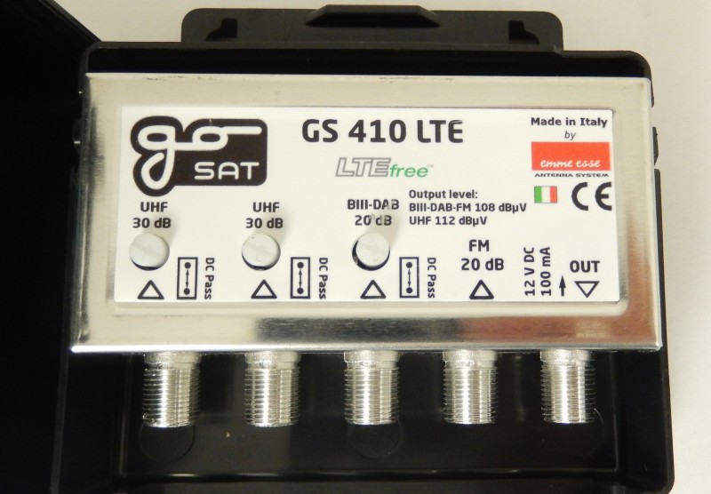 Domový zosilňovač GoSAT so zabudovaným LTE filtrom vyrobený v Taliansku firmou Emme Esse pre Gosat . Vstupy majú voliteľné napájanie a vstupné signály možno regulovať pomocou otočného konektoru.Zosilenie až 112 dBuV.