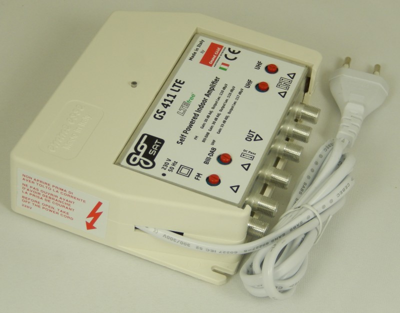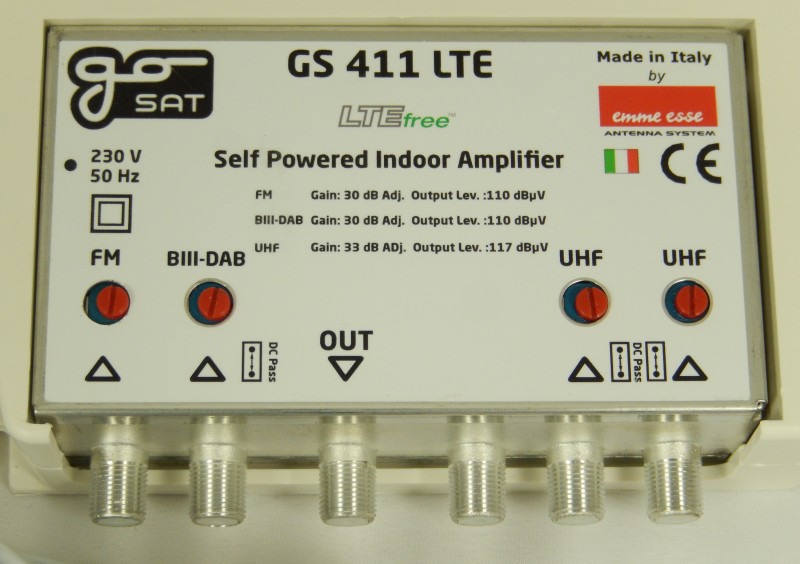 Domový zosilňovač GoSAT so zabudovaným LTE filtrom vyrobený v Taliansku firmou Emme Esse pre Gosat . Zosilňovač so zabudovaným napájaním. Vstupy majú voliteľné napájanie a vstupné signály možno regulovať pomocou otočného konektoru.Zosilenie až 117 dBuV.