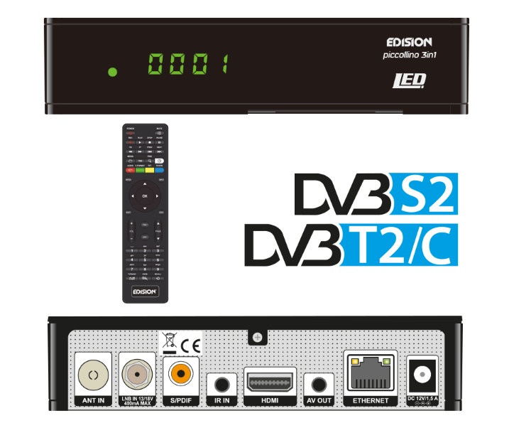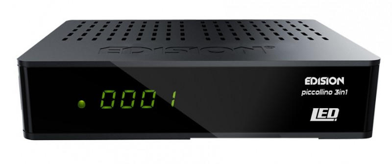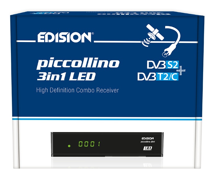 Edision Piccollino 3in1 Full HD digitálny combo prijímač s jednou čítačkou na karty a pre príjem satelitnej televízie a takisto aj príjem terestriálnej a káblovej televízie v normách DVB-S/DVB-S2 taktiež DVB-T/DVB-T2/DVB-C HYBRID tuner.