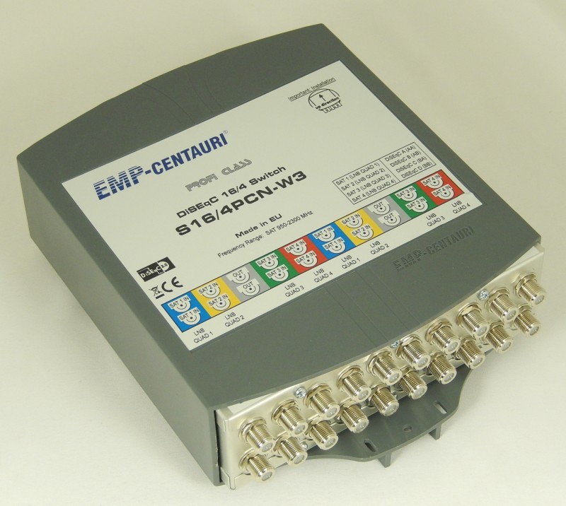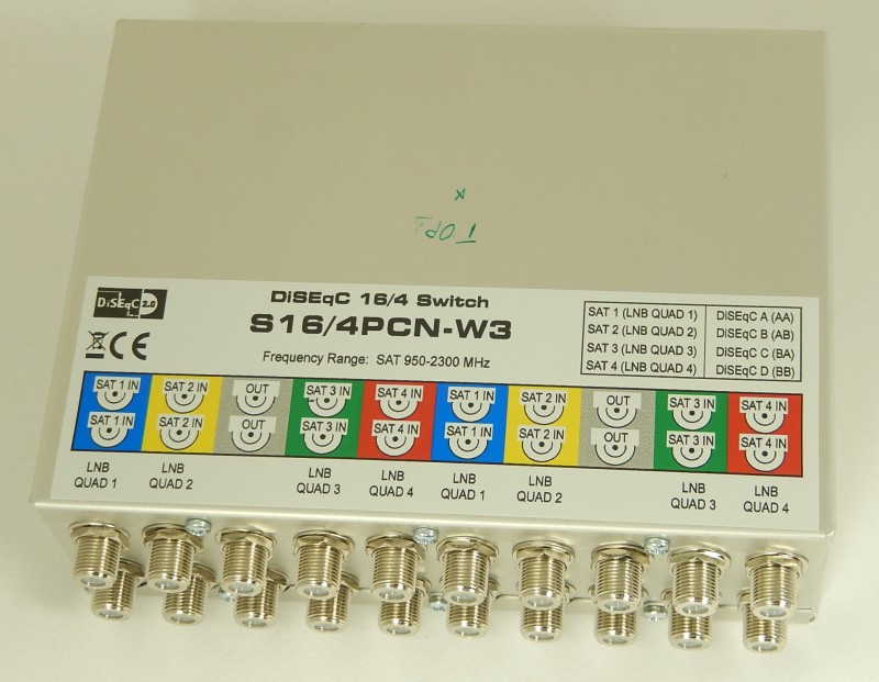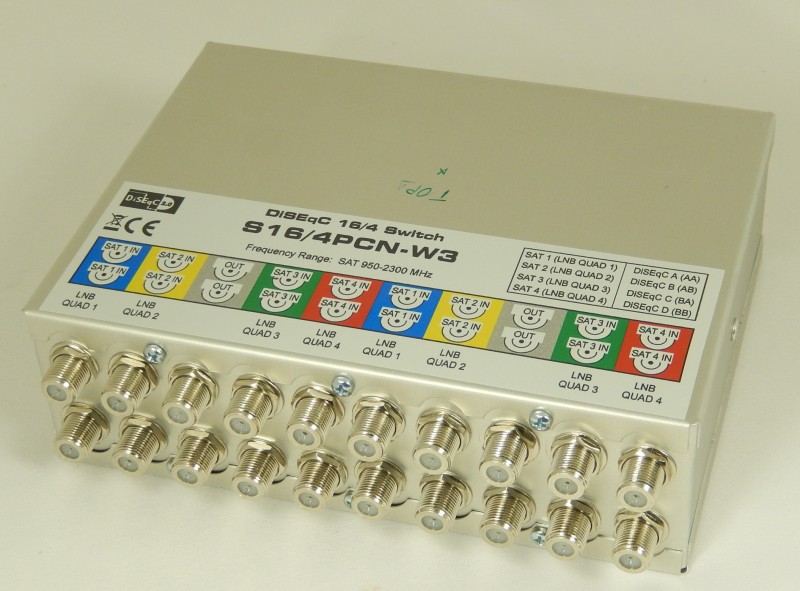 DiSEqC prepínač S16/4PCN-W3 je 16 vstupový prepinač s 4 výstupmi DiSEqC 2.0 pre 4 satelitne pozície a pre 4 satelitne prijímače alebo 2 satelitne prijímače s Twin tunerom .Je určený k prepinaní medzi 3 alebo 4 LNB ktore sa v prijimaci nastavuju DiSEqC 1.0 A/B/C/D.