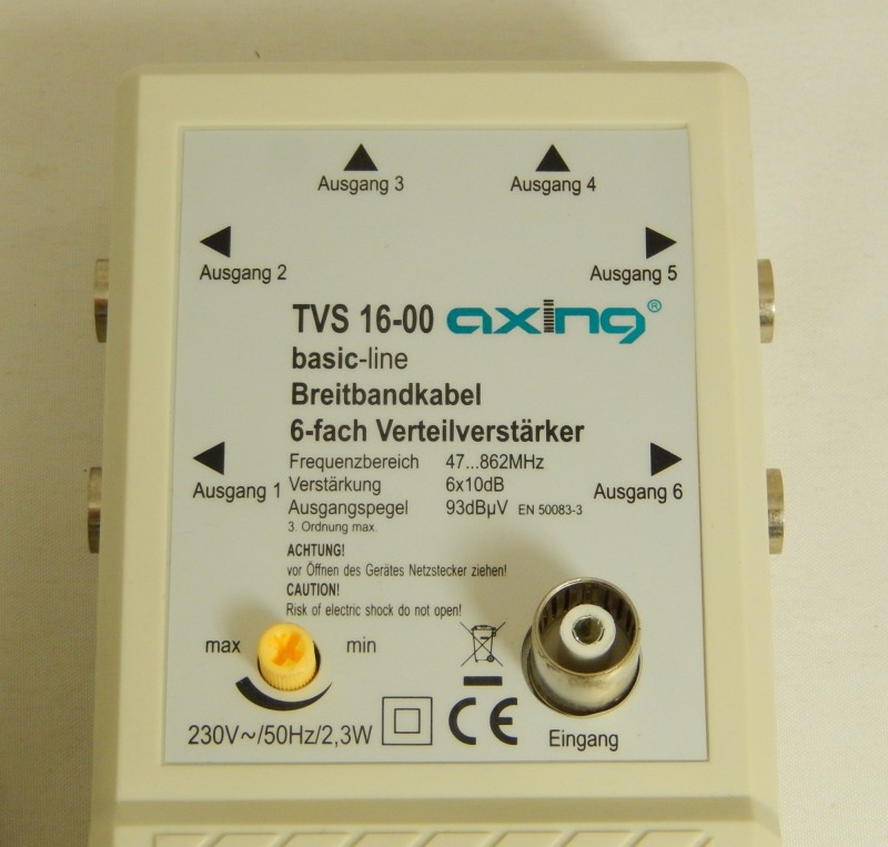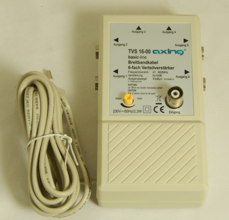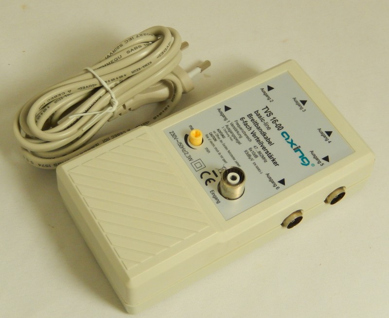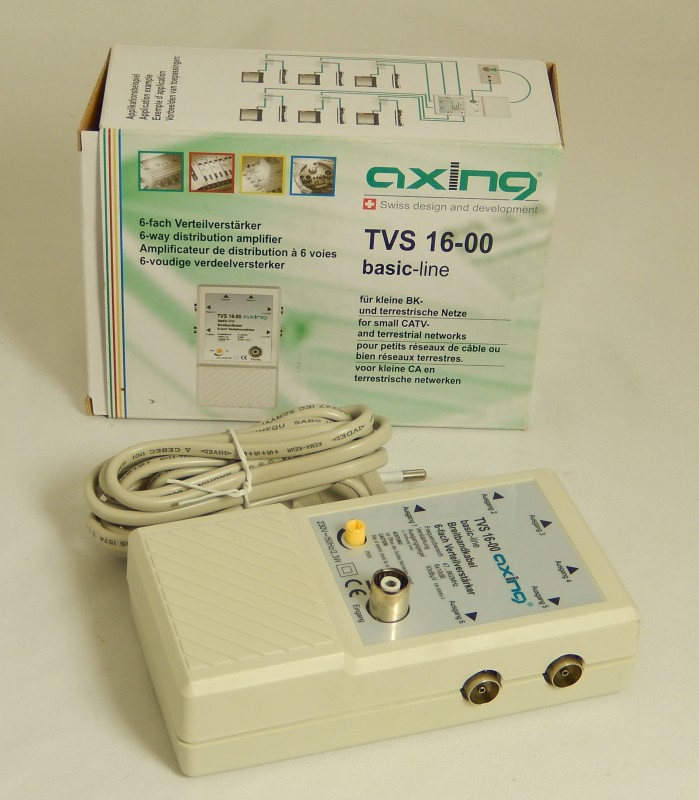 Domový zosilňovač axing TVS 16-00 je určený na zosilnenie TV signálu. 1x Vstup, 6x výstup. Frekvenčný rozsah 47 až 862 MHz. Zosilnenie 6x 10 dB. Prevedenie na IEC (TV) konektory. Napájanie pomocou integrovaného zdroja zo siete 230V AC.