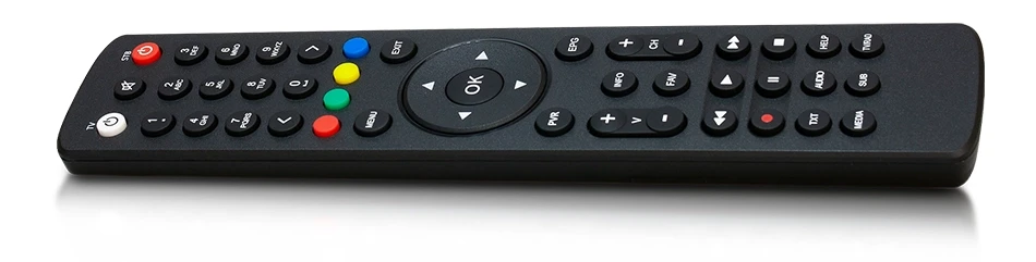 S týmto ovládaním môžete okrem prijímača zapnúť aj televízor a ovládať hlasitosť na Vašej TV. Intuitívne rozmiestnenie tlačidiel v ergonomickom slim dizajne a s matnou povrchovou úpravou pre elimináciu odtlačkov prstov. Segmentačné rozdelenie tlačidlových skupín. Farebné tlačidlá sú umiestnené v blízkosti tlačidla OK a smerových tlačidiel. Optimálnejšie rozdelenie tlačidiel pre orientáciu po hmate.
