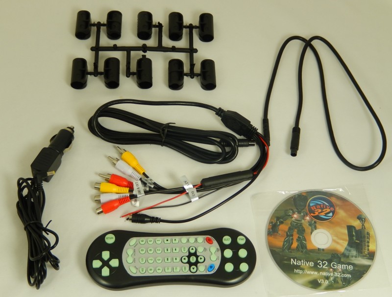 V baleni sú -držiak na opierku , Dialkový ovladač , AV kable, Cigaretovy nabíjač, CD z hrami
