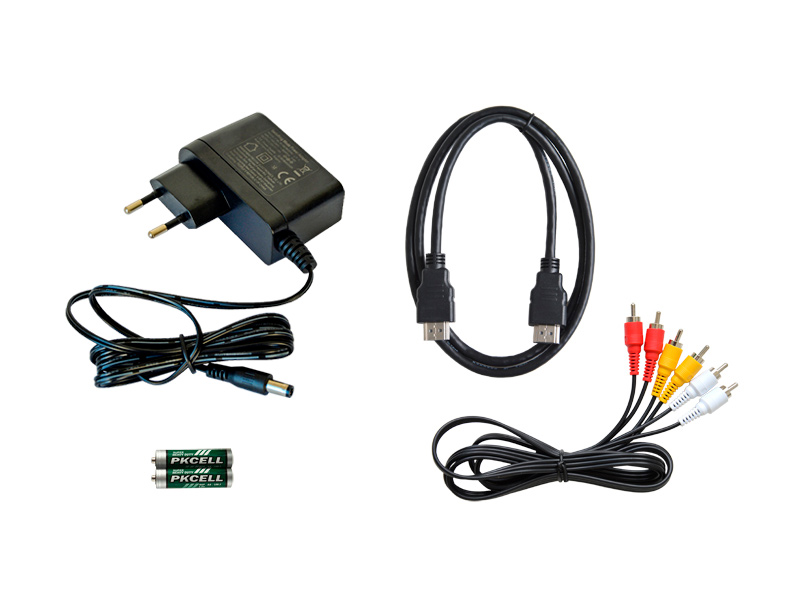 Obsah balenia: prijímač s vloženou satelitnou kartou Skylink, diaľkové ovládanie, batérie, HDMI kábel, analógový AV kábel, návod, napájací adaptér