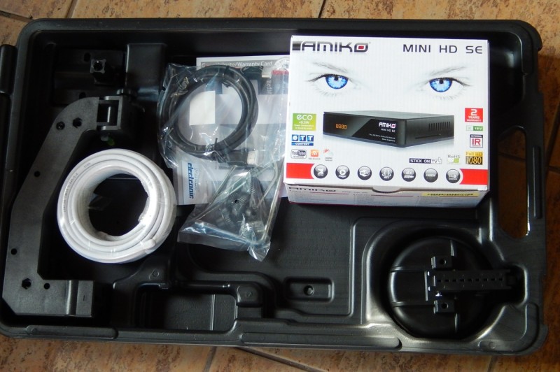 V baleni sa nachadzaju 2 satelitné prijímače jednym Micro Caravan EasyFind - nastavite parabolu s LCD a na druhom - Amiko pozerate kodovacie stanice s kartou.