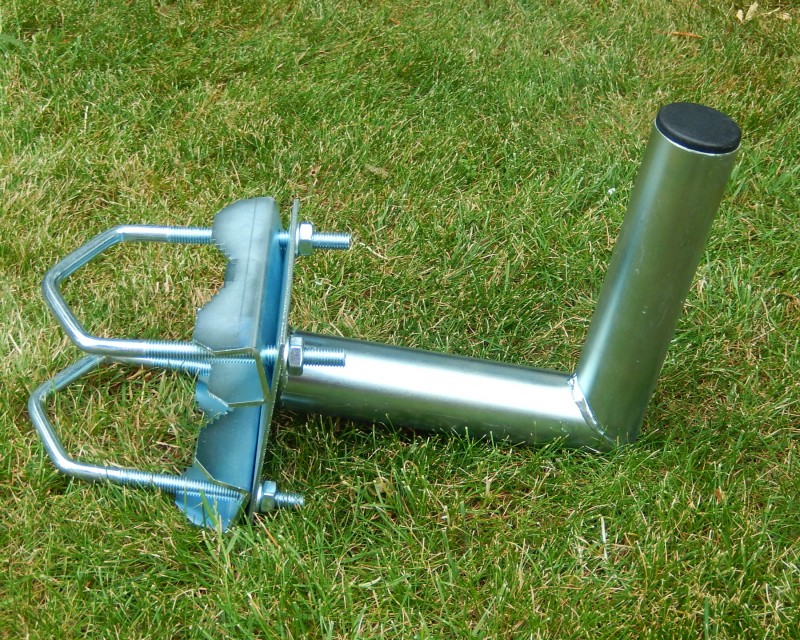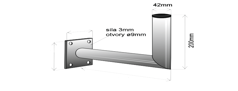 Konzola pozinkovaná s platňou 130 mm x 130 mm so strmeňmi - žralokmi , na prichytenie na balkón, stožiar a tiež aj na stenu. Vzdialená 200 mm od steny s priemerom úchytu 42 mm. Možnost uchytit trubku do priemeru 80mm.