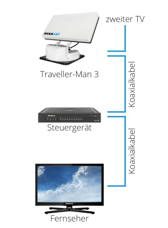 MEGASAT Traveller-Man 3 - Satelitná anténa s dvojitým vstupom a funkciou automatického zošikmenia. Veľmi nízka konštrukčná výška len 14 cm v zatvorenom stave. Inteligentný ovládač s bezplatnou aplikáciou na aktualizácie firmvéru a výber satelitu. Vhodné pre pevnú inštaláciu alebo voliteľne s mobilnou súpravou Mobil-KIT 3 ako prenosná anténa.