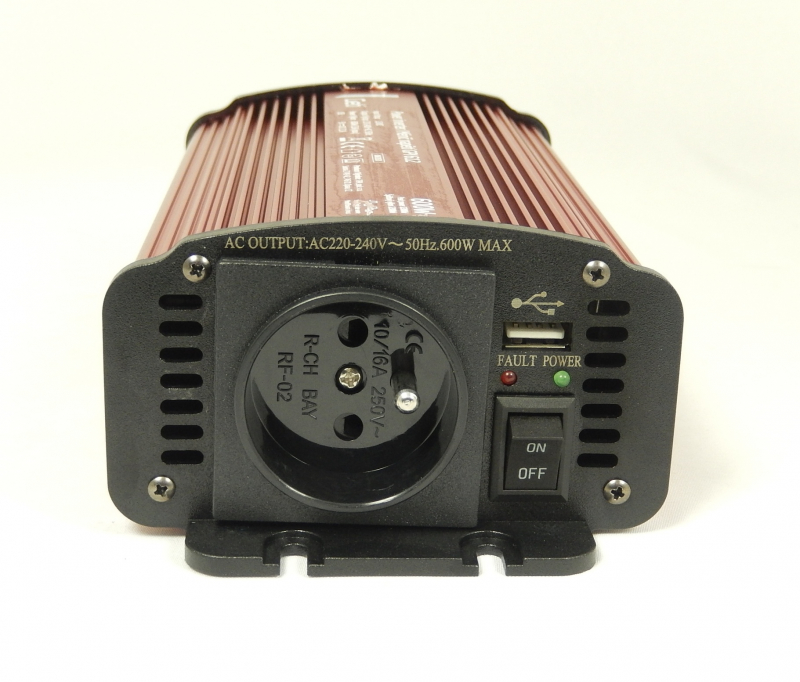 Ideálny pre pripojenie digitálnej kamery, mobilného telefónu, notebooku, tlačiarne, lampy, CD / DVD prehrávača, rádia atď s maximálnym príkonom do 600W. Menič je rovnako vybavený USB výstupom pre napájanie rôznych zariadení cez rozhranie typu USB 2.0. Prístroj obsahuje ochranu proti opačnej polarite, nízkemu / vysokému napätiu, skratu, preťaženiu, prehriatiu a vysokému / nízkemu napätia batérie. Zvlnenie výstupného napätia má tvar modifikovanej sínusoidy.