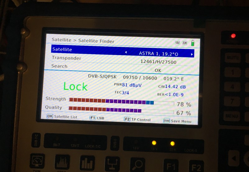 Automatická detekcia satelitov NIT vám okamžite zobrazuje, na ktorej družici ste. Integrovaná batéria ponúka až 4 hodiny prevádzky. Nabíja sa obyčajným napájaním 230V alebo adaptérom na nabíjanie do auta. Priložená ochranná objímka s nosnými popruhmi chráni merač pred nečistotami a striekajúcou vodou.