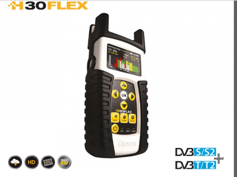 Televes 593302 H30FLEX DVB-S/S2 + DVB-T/T2 is a hand-held professional signal meter and analyzer, for DVB-S/S2 + DVB-T/T2 signals. Very light and compact is easy to use in the installation site as well as in the laboratory. It features professional accuracy and measurement speed and it is fully and easily upgradable to DVB-C and dCSS - SCR, with optional extra software 593233 Option DVB-C and 593234 Option dCSS - SCR. The color 2.8" TFT 400 x 240 screen displays clear measurement images as well as video and audio of the TV program selected. It also has 400MB internal storage for measurement logs and USB 2.0 port for downlaoding datalogs and upgrading the sofrware. The boot time is under 10 seconds and the battery is new Smart Li-Ion which offers up to 4 hours continuous use! Plus, as a 100% professional tool it has professional protection of 1 m (3 ft) drop to concrete on all sides!