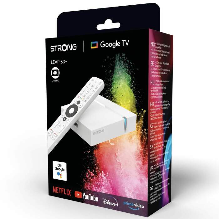 Objavte nový rozmer zábavy s multimediálnym prehrávačom Strong LEAP-S3+ V2! Tento elegantný TV box prináša plynulé prehrávanie v 4K Ultra HD rozlíšení s podporou HDR10+ a Dolby Vision, čo znamená dokonalý kontrast, realistické farby a bezkonkurenčný vizuálny zážitok. Vďaka štvorjadrovému procesoru, 2 GB RAM a 16 GB úložisku beží svižne a spoľahlivo. Sledujte Netflix, Disney+, YouTube, ANTIK TV a ďalšie služby, streamujte obsah cez Chromecast alebo si užite priestorový zvuk Dolby Atmos. S Google Asistentom a pohodlným Bluetooth diaľkovým ovládaním máte všetko pod kontrolou. Pripravte sa na nekonečnú zábavu – stačí pripojiť a užívať si!