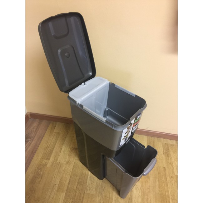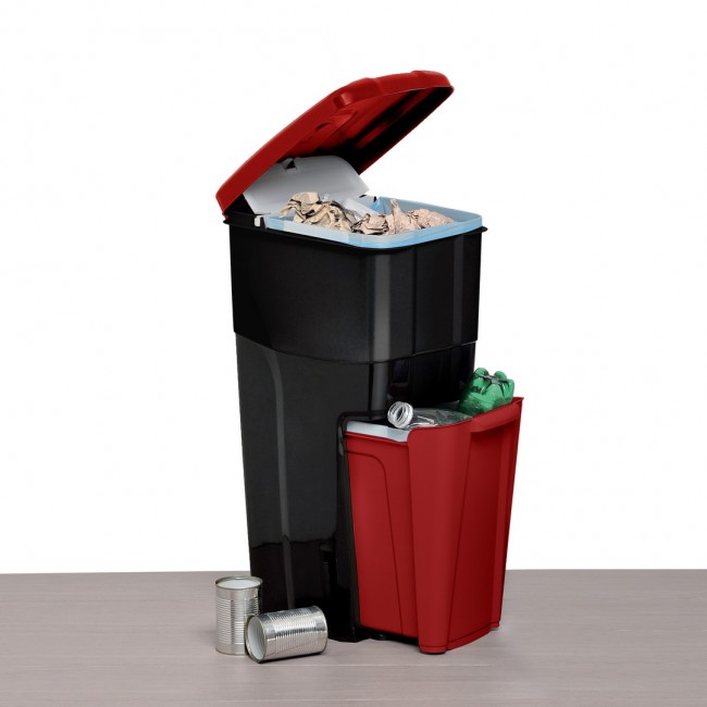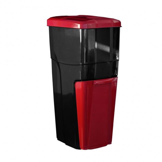 Plastový odpadkový kô s dvoma komorami. Spodná nádoba sa vysúva dopredu, do hornej nádoby uloíte odpad otvorením veka. Do spodnej komory je moné odklada napríklad pouité sklenené fžae (výka im ideálne zodpovedá). Praktickou pomôckou sú aj úchytky, ktoré dria vrecká na horných bočných hranách koa, take pri plnení sa vrece neposúva ani nevyvlieka z horného okraja, ale pekne drí tvar a do úplného naplnenia. 100% recyklovatežný plast.