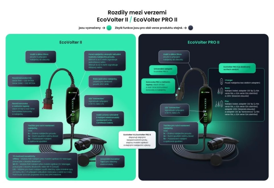 Nový EcoVolter & EcoVolter PRO druhej generácie prináša širokú škálu možností. Či už potrebujete jednoduché offline riešenie, alebo profesionálne fleetové riešenie s LTE pripojením a MID certifikovaným meraním na fakturáciu či presné meranie spotreby. EcoVolter II & EcoVolter PRO II sa plne prispôsobí Vašim potrebám – vyberte si medzi variantmi 11kW alebo 22kW . Kúpte si pokojne Offline verziu. Pokiaľ v priebehu používania zistíte, že potrebujete pripojenie cez Wi-Fi, jednoducho prikúpite konektivitu v našej mobilnej aplikácii EV-Manager a môžete naďalej používať rovnaký prenosný Wallbox a využívať oveľa viac funkcií.