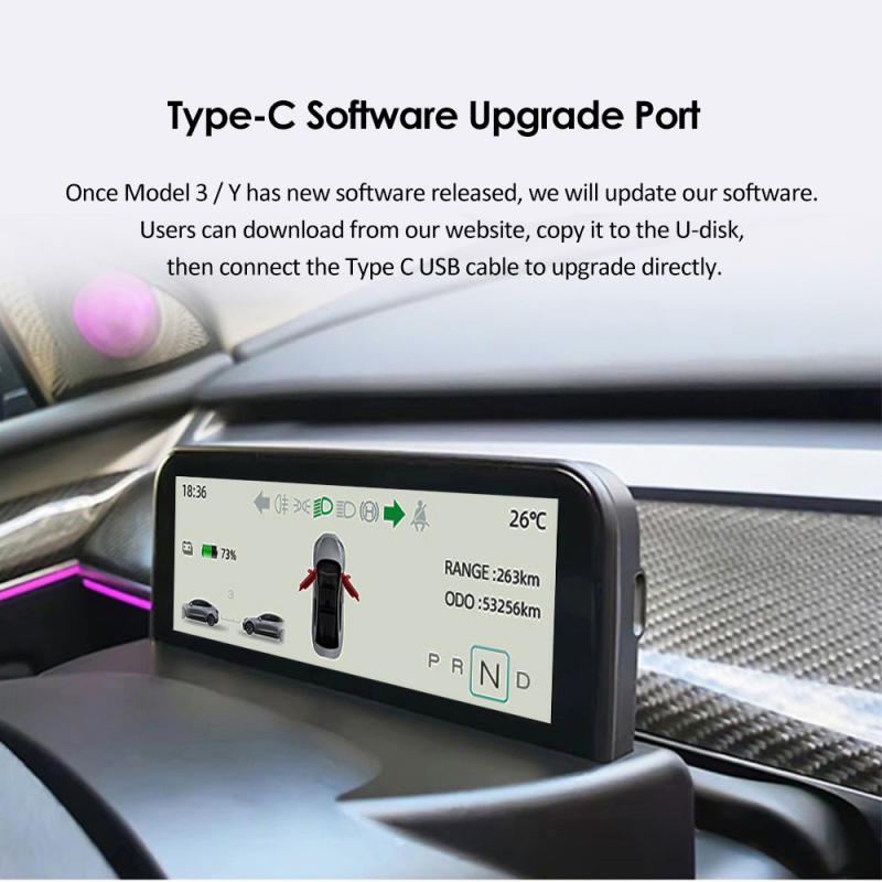 Prístrojová doska - TESLA Y Tento cluster je špeciálne vyvinutý pre Tesla Model 3 a Model Y, ktorý je kompatibilný s pôvodnými informáciami o aute. Panel sa vyznačuje ľachkou inštalaciu do vašho auta, môžete okamžite poznať všetky informácie o vozidle.