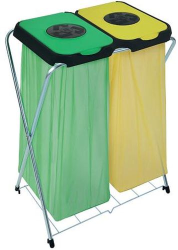 Stojan na dve vrecia pre triedený odpad s podpornou mriežkou pre podperu spodku vrecia s ťažším odpadom. Uprostred každého veka je kruhový otvor pre ľahké vhadzovanie menších odpadkov, bez potreby celej veko otvárať.
