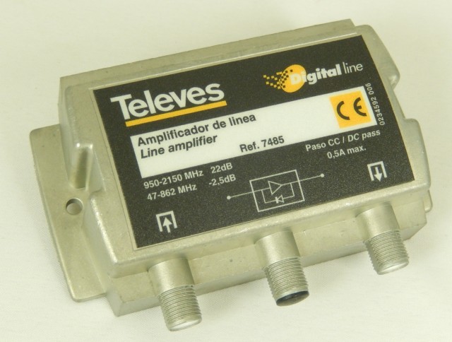 Televes anténny zosilovač pre terestrialny a satelitný prijem zo zosilením 20dB, napajanie po koaxialnom kably.