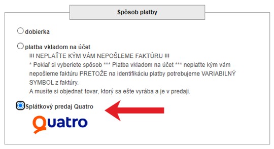 3/ v druhom kroku objednávky PRI SPÔSOBE PLATBY jednoducho zaškrtnite položku Splátkový predaj Quatro
